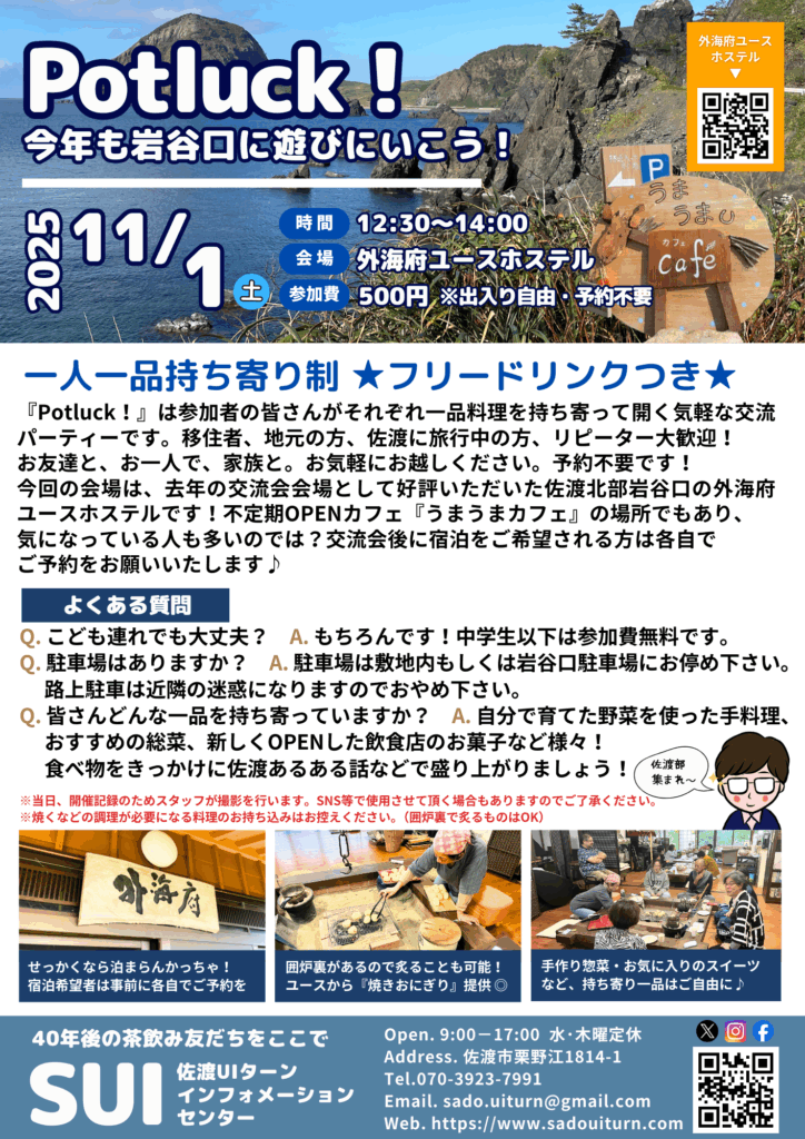 去年の11月もお邪魔した岩谷口の外海府ユースで、今年もpotluck!を行います!!!