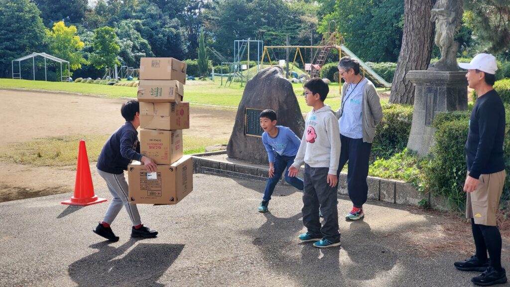 自己紹介を交えた暗記ゲーム、積み段ボールリレー、チャンバラ、カラーボール入れ、尻尾とり、という流れでこどもたちも含め2時間いっぱい運動! こどもたちは休憩時間も仲良く走り回っていましたが、大人はやっぱりヘトヘトに(笑)  家族単位での参加が複数あったため、こども同士での交流も生まれ、交流会後に子どもたちだけで遊具で遊んでいる姿はとても印象的でした🌟