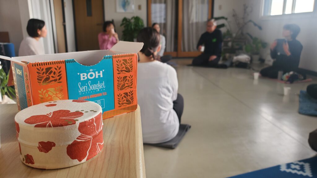 1時間ほどしっかりと体をほぐした後は、ノンカフェインドリンクを飲みながら、自己紹介や、お気に入りのリラックス方法、健康についてのお悩みなどをテーマに団らん☕  ヨガをしたことでなかなか動かしづらかった肩回りがすっきりした!と、かなえさんが行うヨガ教室に継続して通いたいという声も挙がり、参加者、講師の両者にとっても良い交流会となりました!