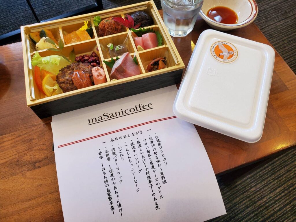 11:00 まち歩き前の腹ごしらえは【maSanicoffee】で、特製お弁当! 「佐渡を感じられるお弁当をお願いします!」というリクエストから、肉・魚・副菜からすべて佐渡!佐渡!佐渡!の大満足なランチになりました。maSanicoffeeを運営する兵庫工務店の中村さんから、カフェの立ち上げや、地域とのつながりを伺い、さっそく写真やメモを取る両津班。