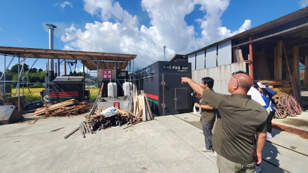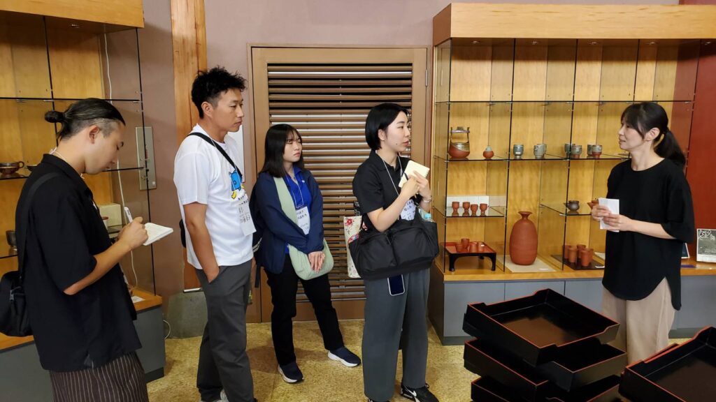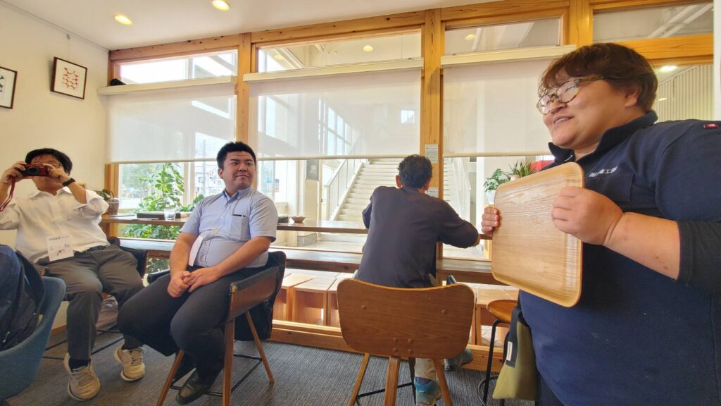 2ヵ所目はそのまま両津へ向かう本線の道中にある【吉井木材工業】で、代表の水野さんから会社案内をしていただきました。佐渡の木である「アテビ」の特徴や、コースターや佐渡土産の製作に使用しているレーザー加工機を見せていただくなど、離島でありながら島外にも自慢できるほどの高い技術に触れました。「島のなかに産業(工場等)があることがすごい」と漏らすメンバーも。